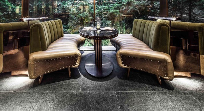 On one side, the tall windows face a lush jungle garden at the base of a hill, peering up at the walking bridges above in the gardens.