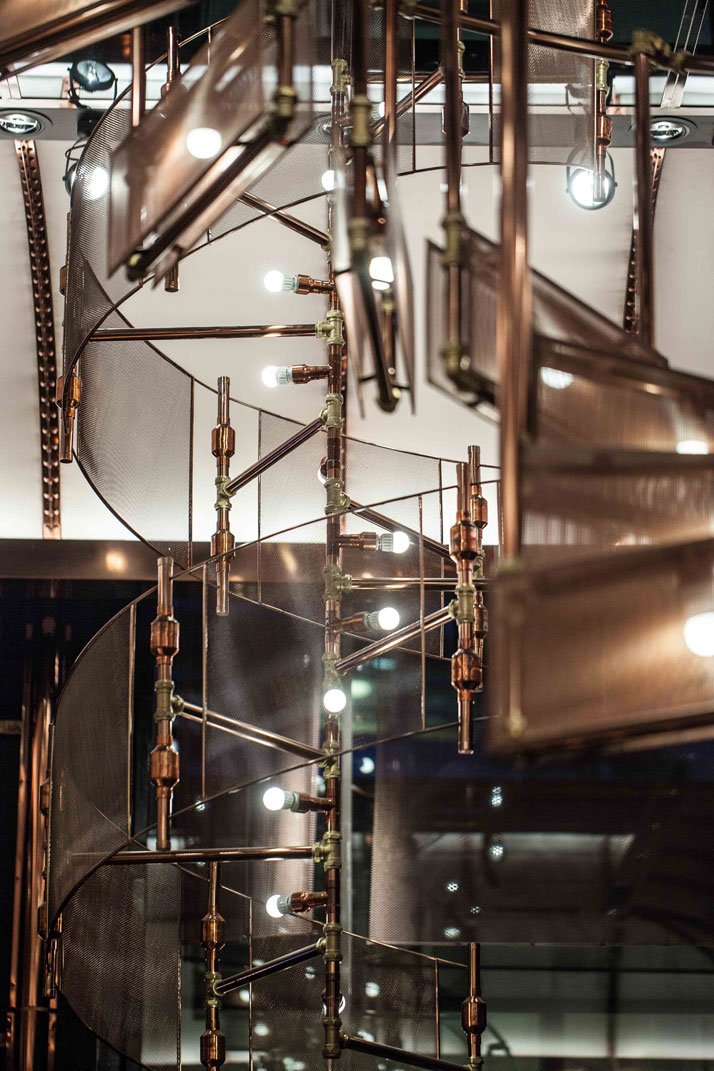 As you enter, you are impressed by the hanging, deconstructed spiral staircase light fixture and the backdrop of copper piping, an embossed pattern covering the wall behind the bar. The elements combine well and create a refined atmosphere with a steampunk edge. Once you sit and start to take in the different elements, every detail begins to gain importance, from the green velvet banquettes by the window to the wood choices. Ammo is very well put together.
