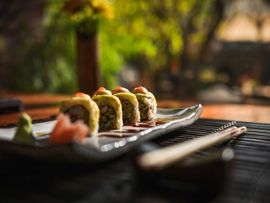 The multi-course dinner at the Krishnarpan Restaurant begins when the traditionally adorned server brings that evening's menu, individually addressed with your name, printed on handmade paper.