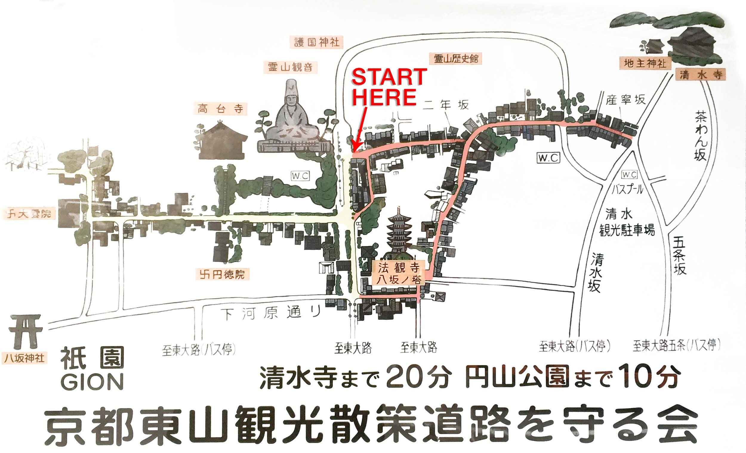 Suggested route marked in pink – top right Kiyomizu-dera. Start early to enjoy the quiet streets. Many travellers head first to Kiyomizu-dera to beat the crowds. Stroll down through the famous Sannenzaka and Ninenzaka slopes, browsing the shops and sampling treats. Pause at Kōdai-ji Temple and nearby gardens. Continue towards the Yasaka Pagoda (Hōkan-ji) — one of Kyoto’s most photogenic spots. End your walk at Yasaka Shrine.