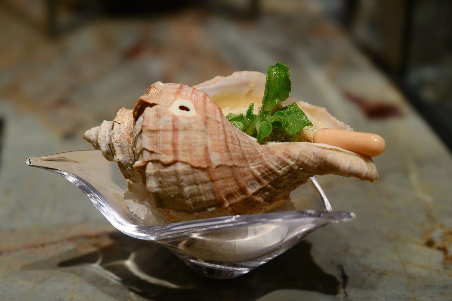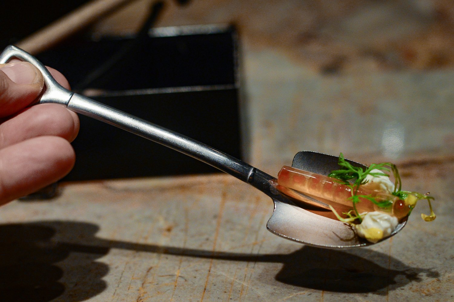 Dinner commences with a small toolbox containing a small hammer, mini shovel, tweezers, saw and a tape measure with the menu printed on it (which was pretty slick). A series of dishes follow this.