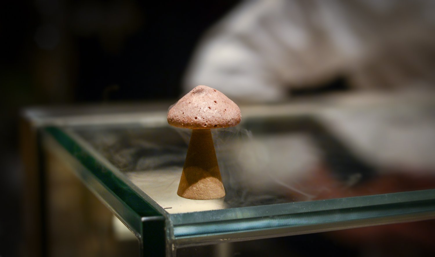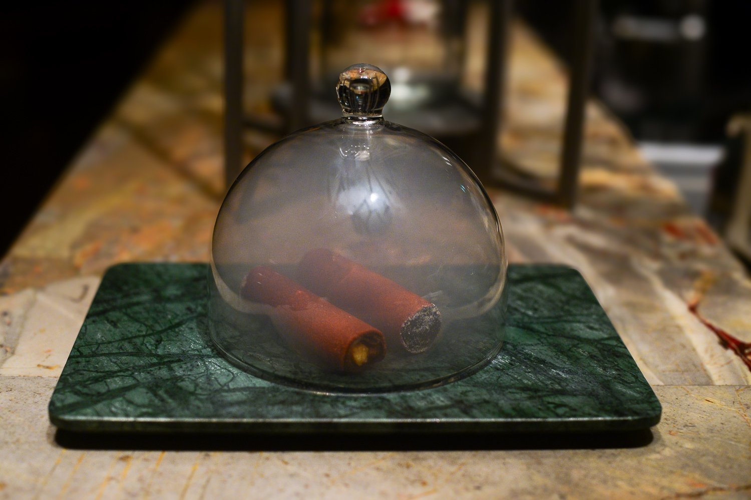 Cigar Leaf Smoked cherry root and crispy potato crust; lined with an green apple gel sheet and filled with cucumber black sesame ash [/caption]
